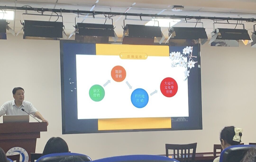 肖洁秘书长主要以扬州瘦西湖为例向同学们介绍旅游新媒体营销应用与实践;对城市进行重新定位和营销定位。针对目前营销理念转型、品牌地位转型、文旅产品转型这“三大转变”来吸引更多年轻消费者。李丽部长从历史发展角度为同学们介绍扬州的来历,讲述了吴越两国、隋炀帝、隋朝大运河、康乾君主与扬州的密切联系。除此之外,还带同学们欣赏了瘦西湖、个园、何园的美景,通过诗词来介绍名胜景点,让同学们对扬州文化有了更深刻的了解。